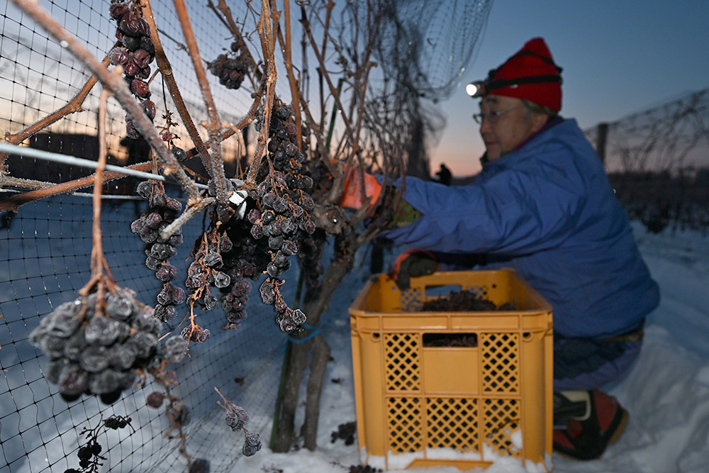 ・極寒の中アイスワイン用ブドウ収穫 池田