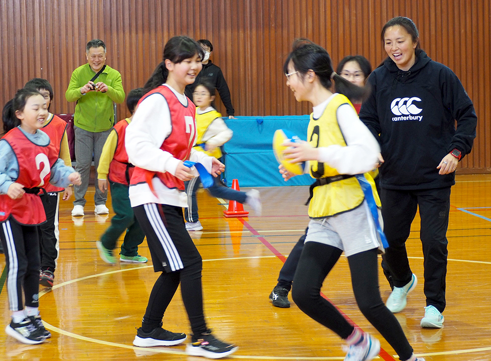 ・オリンピアンの桑井さんが児童にタグラグビーを指導 幕別糠内小で特別授業
