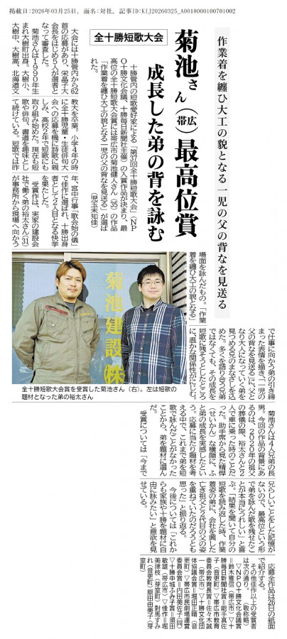 2026年3月25日付十勝毎日新聞の最高賞を受賞した菊池健人さんのインタビューです。